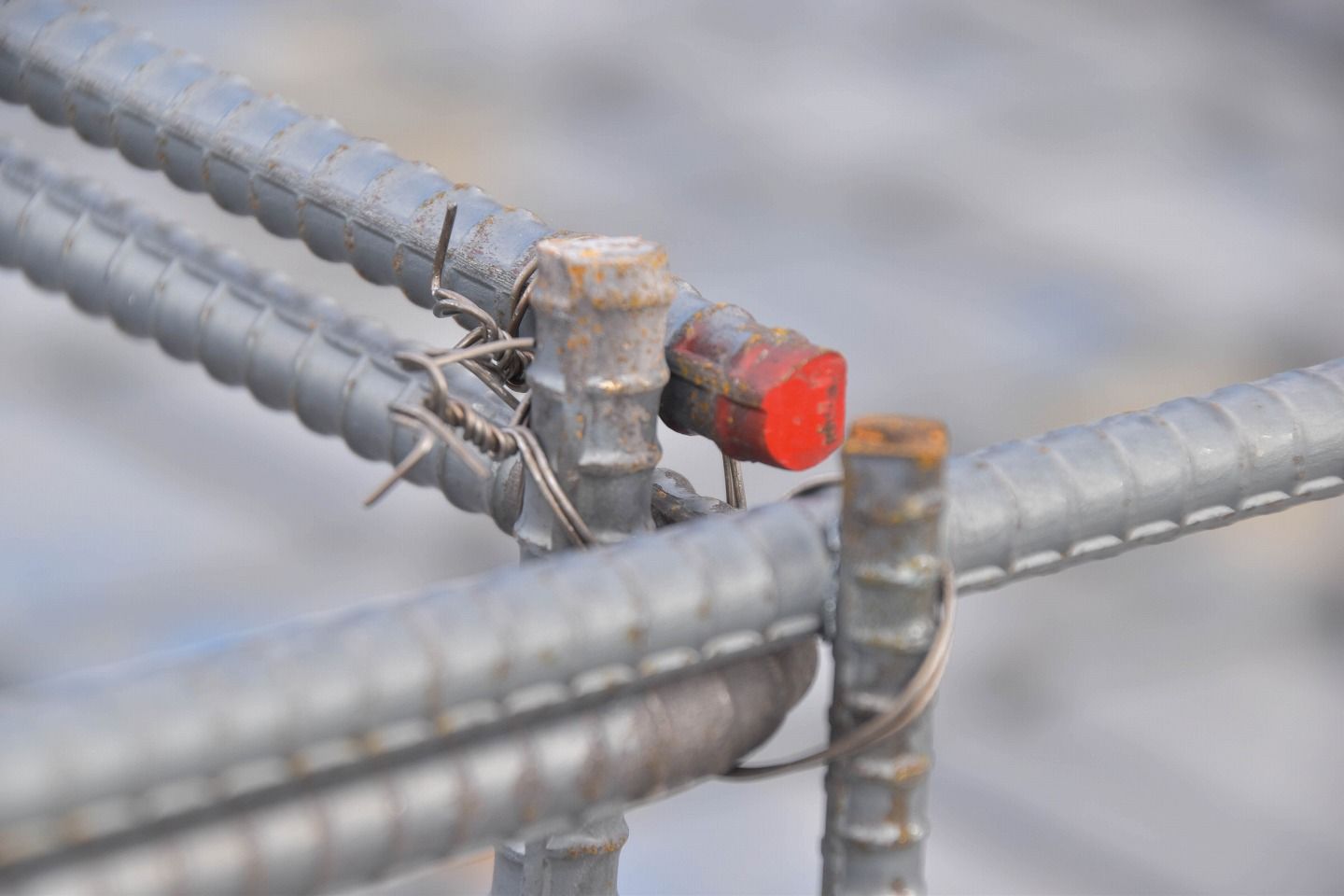 ▼鉄筋と鉄筋が交差する部分は、「結束線」と呼ばれる細い針金で結んで固定していきます。固定の仕方も鉄筋工事独特で、 結束線で輪を作って絞るように締め上げます。
