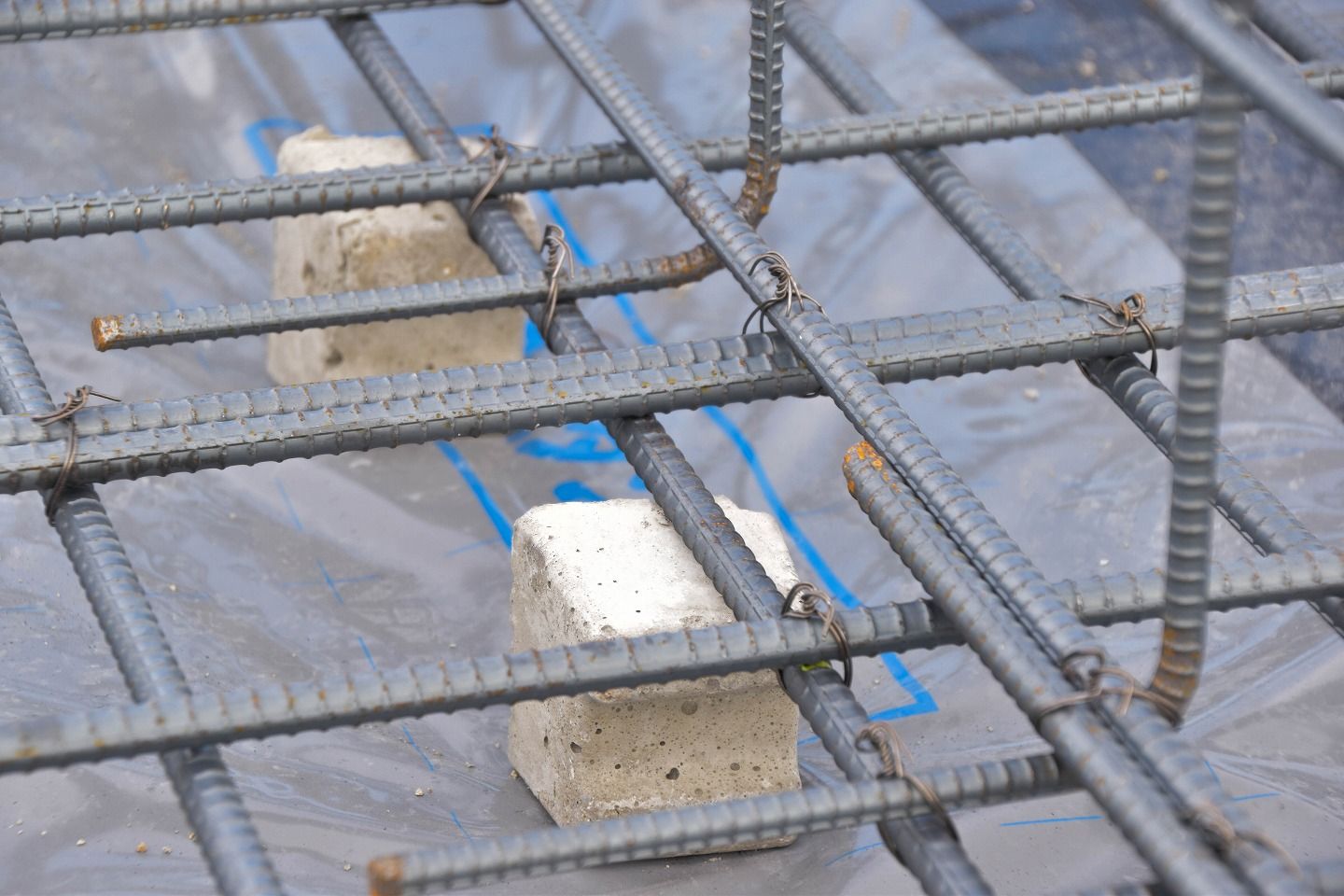 砕石転圧は敷き詰めた砕石に圧力を加えて地盤を締め固めること。これにより、沈下やズレを防ぎ、平らで安定した地盤が形成され、建物の耐久性を向上させています。その上をターミダンシートで覆い、防湿・防蟻の役割を果たします。 ▼これから組まれていく配筋の下には、「サイコロスペーサー」と呼ばれるブロックが敷かれています。これは60㎜以上のかぶりを確保するために敷かれています。