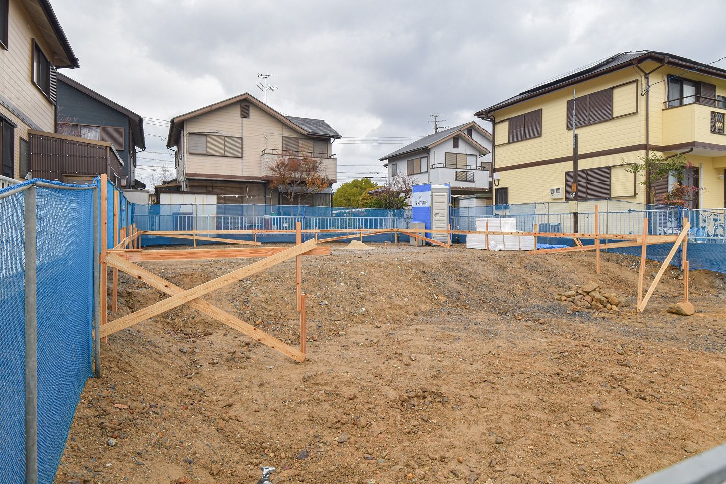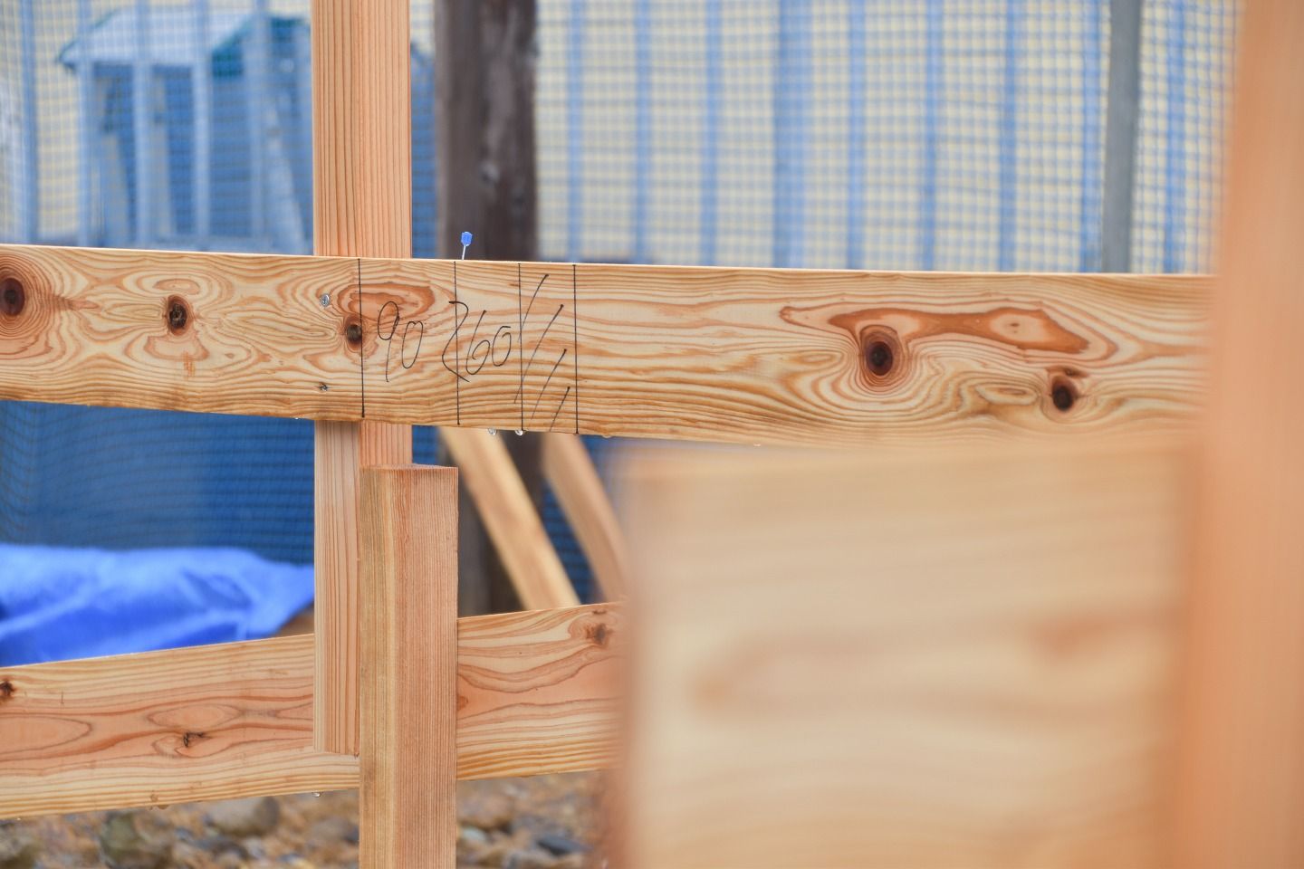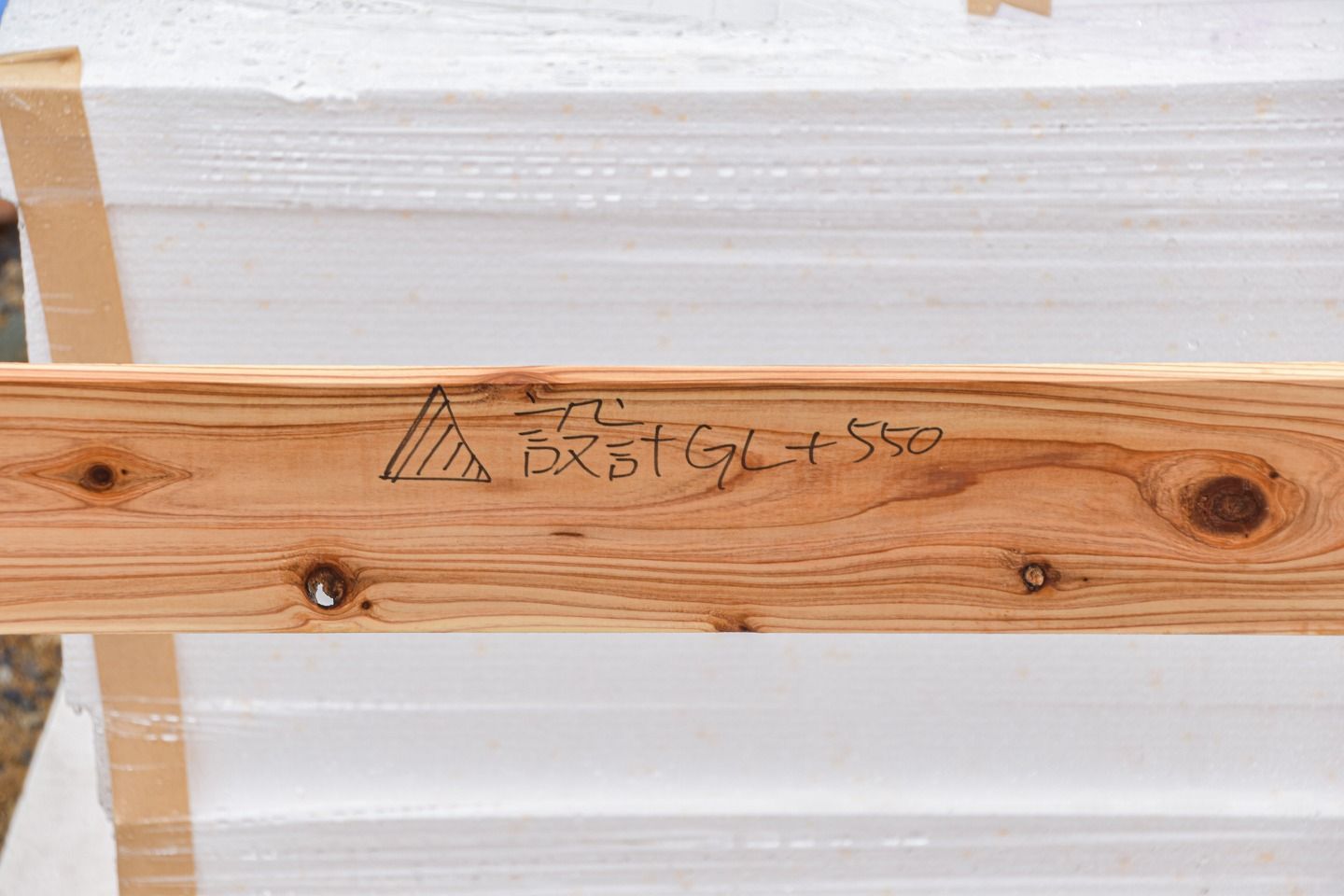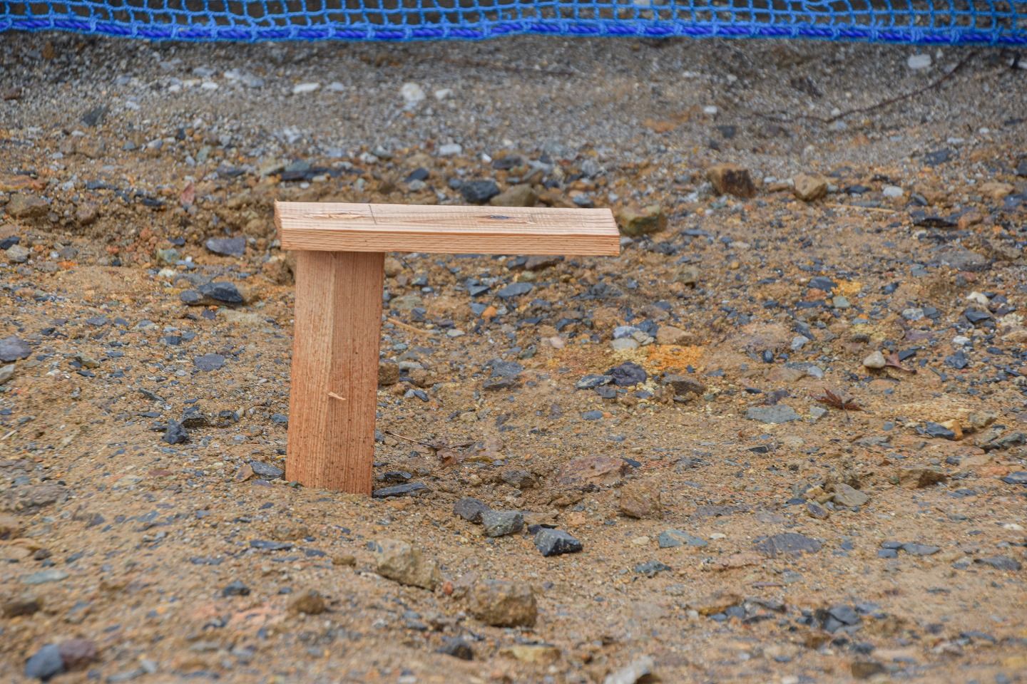 ▼土地を囲むようにぐるりと取り付けられている板は「遣り方(やりかた)」です。これは、基礎工事の一番初めに建物の位置を出していく作業で、これから進む建築の全ての「基準」となる重要なものです。