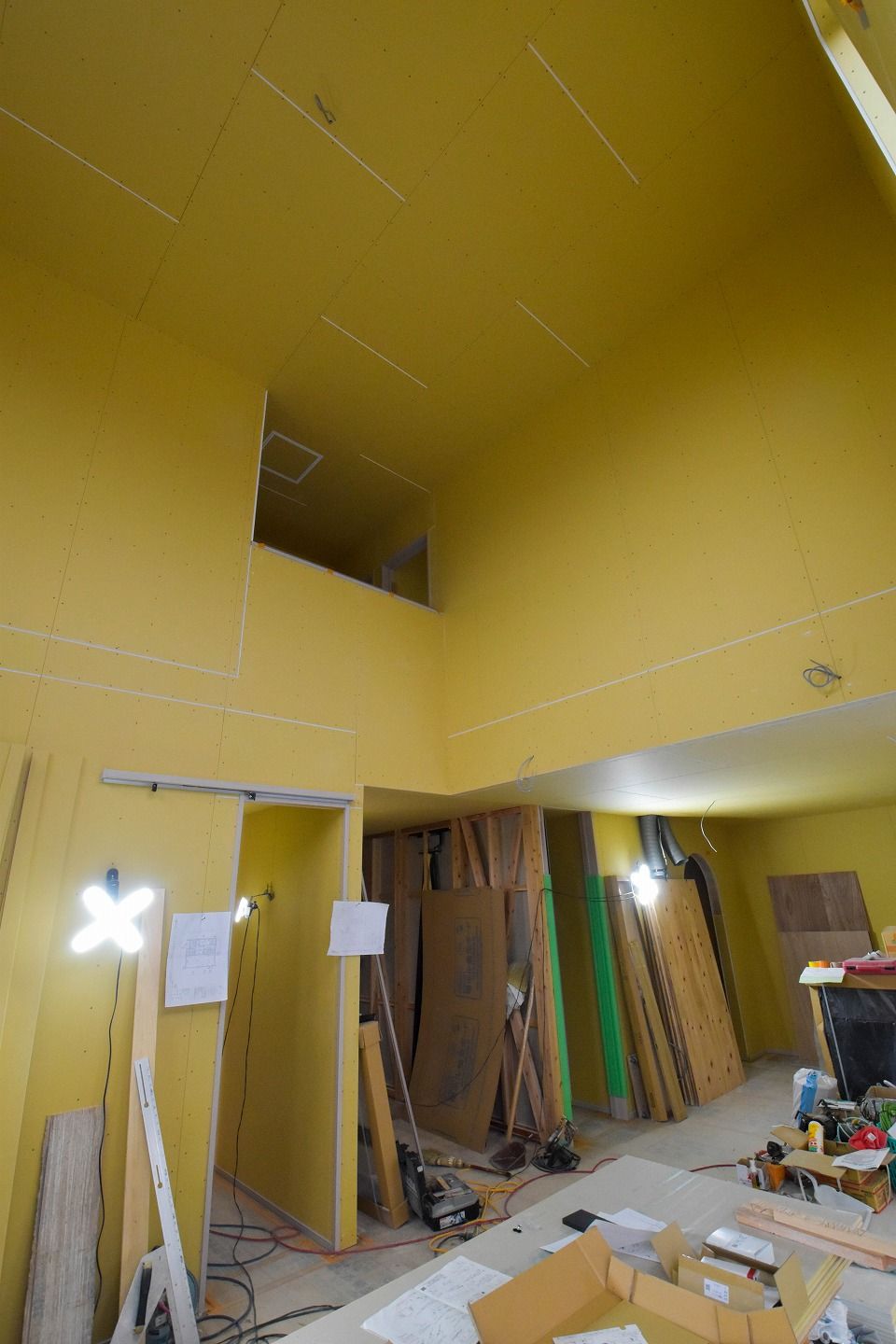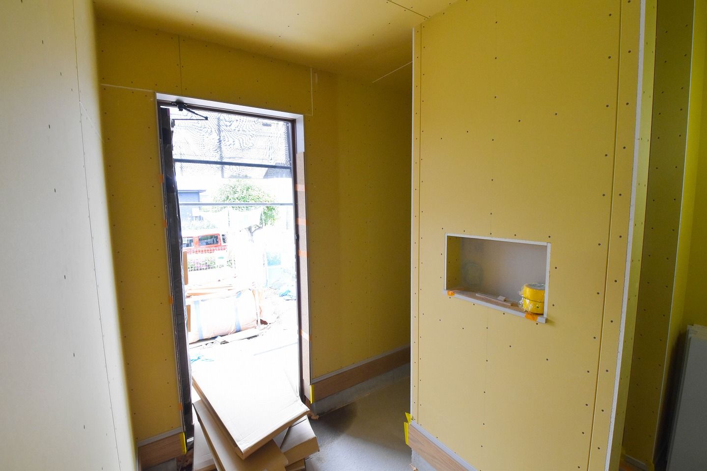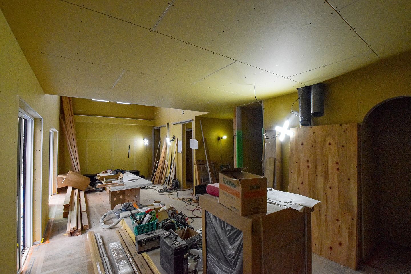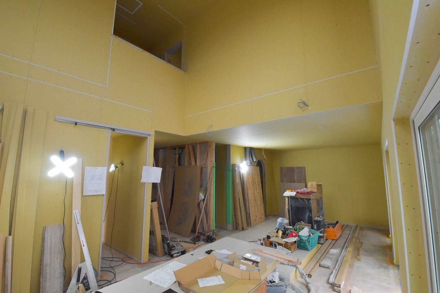 ▼リビングの様子です。こちらも石膏ボードで覆われ、着実にと工事が進んでいるのが分かります。
