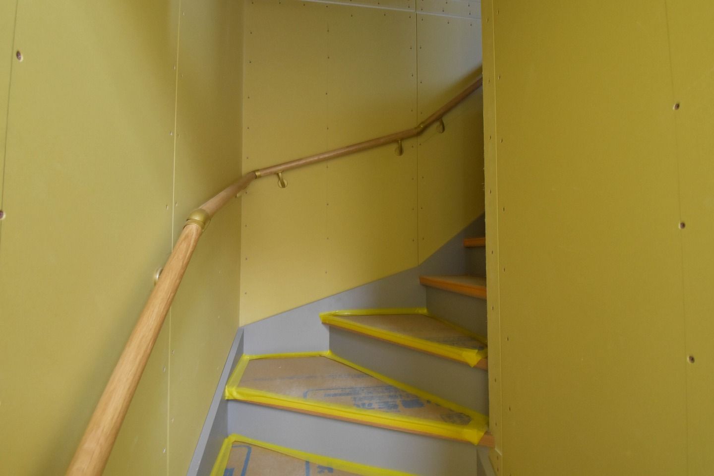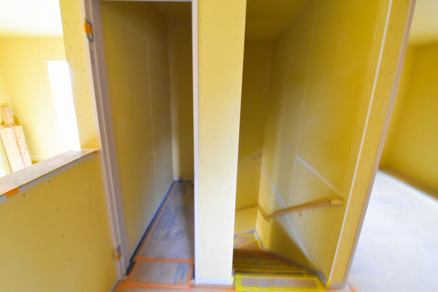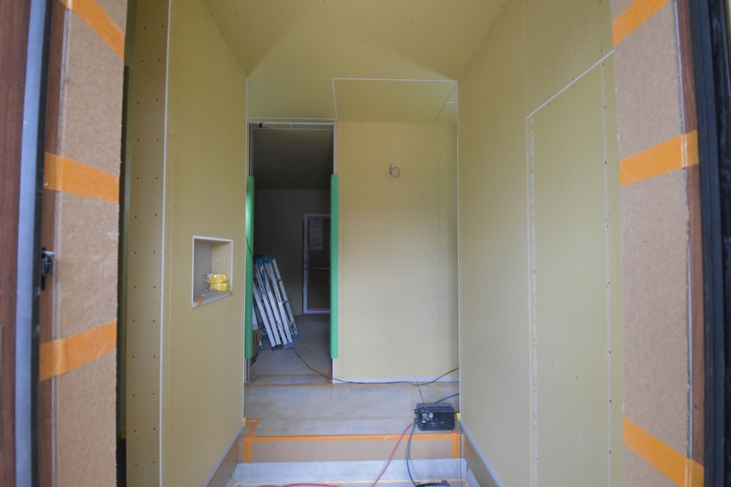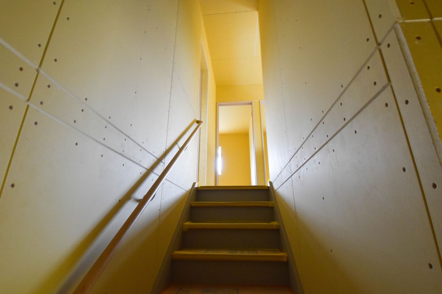 ▼まずは1階、玄関からの様子です。全体が黄色の石膏ボードで覆われています。