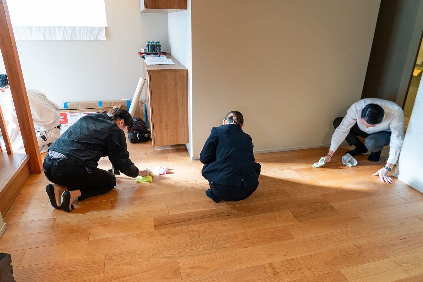 ▼お引渡し前の最終チェックです!みんなで綺麗にしてお引渡しです!