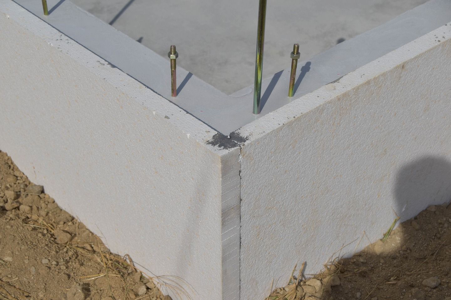 ▼立ち上がりコンクリートの外側、つまり家の外側に当たる部分には、白いボードが取り付けられています。これは基礎断熱材の『オプティフォーム』と呼ばれる部材です。高気密・高断熱住宅を実現するためには欠かせないものとなっています。