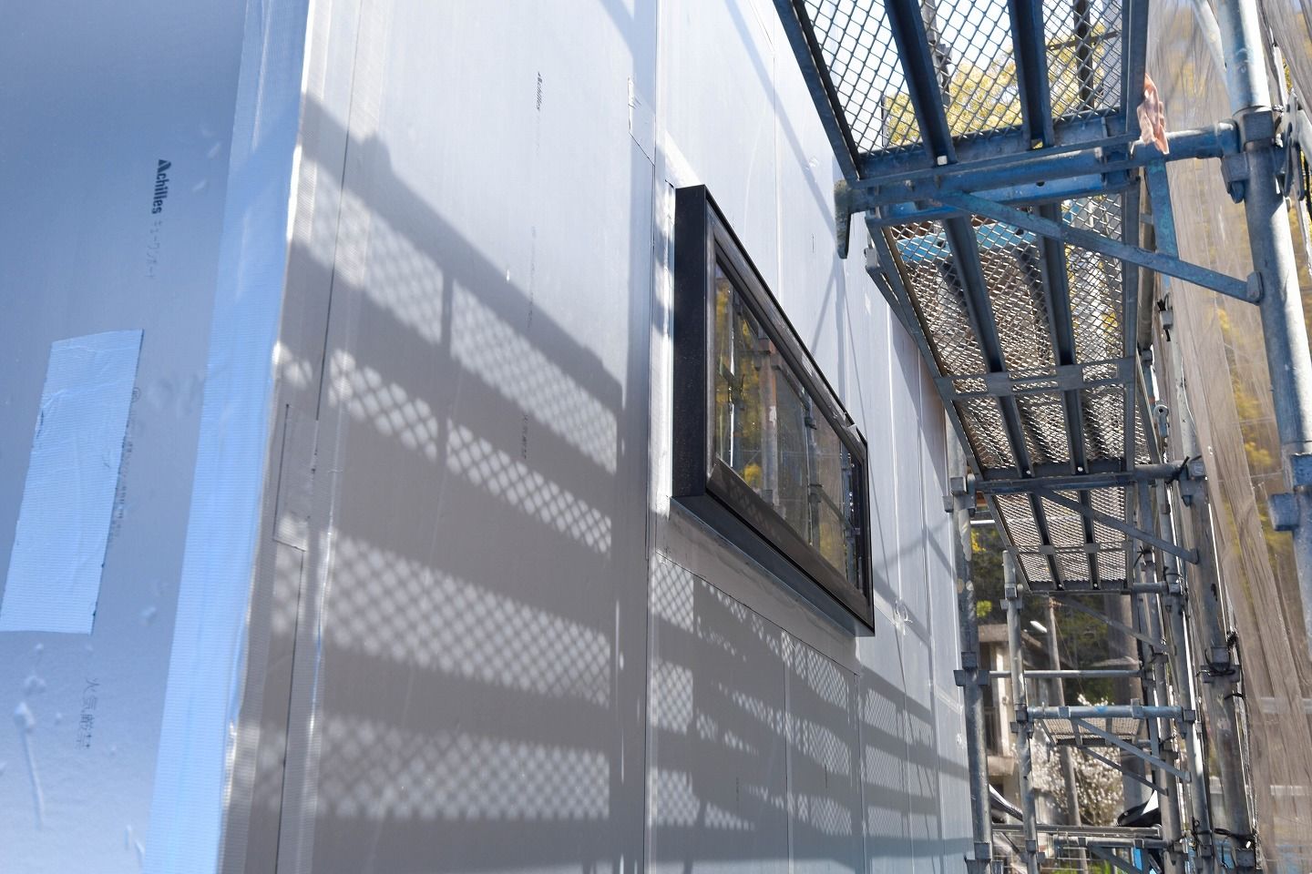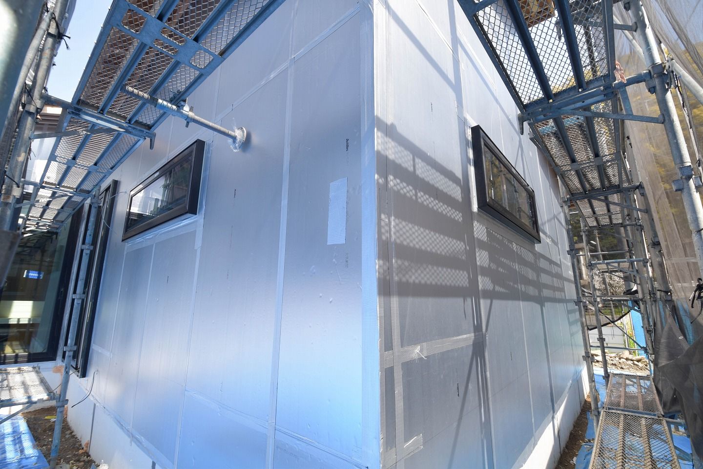 ▼外観はシルバーの素材に覆われています。「耐力面材あんしん」の上に、外断熱材のキューワンボードが取り付けられています。高い赤外線反射率によって夏季の遮熱に効果があるアルミ箔です。さらに、高性能硬質ウレタンフォームの断熱性能と併せることにより、住宅の省エネルギーに貢献!