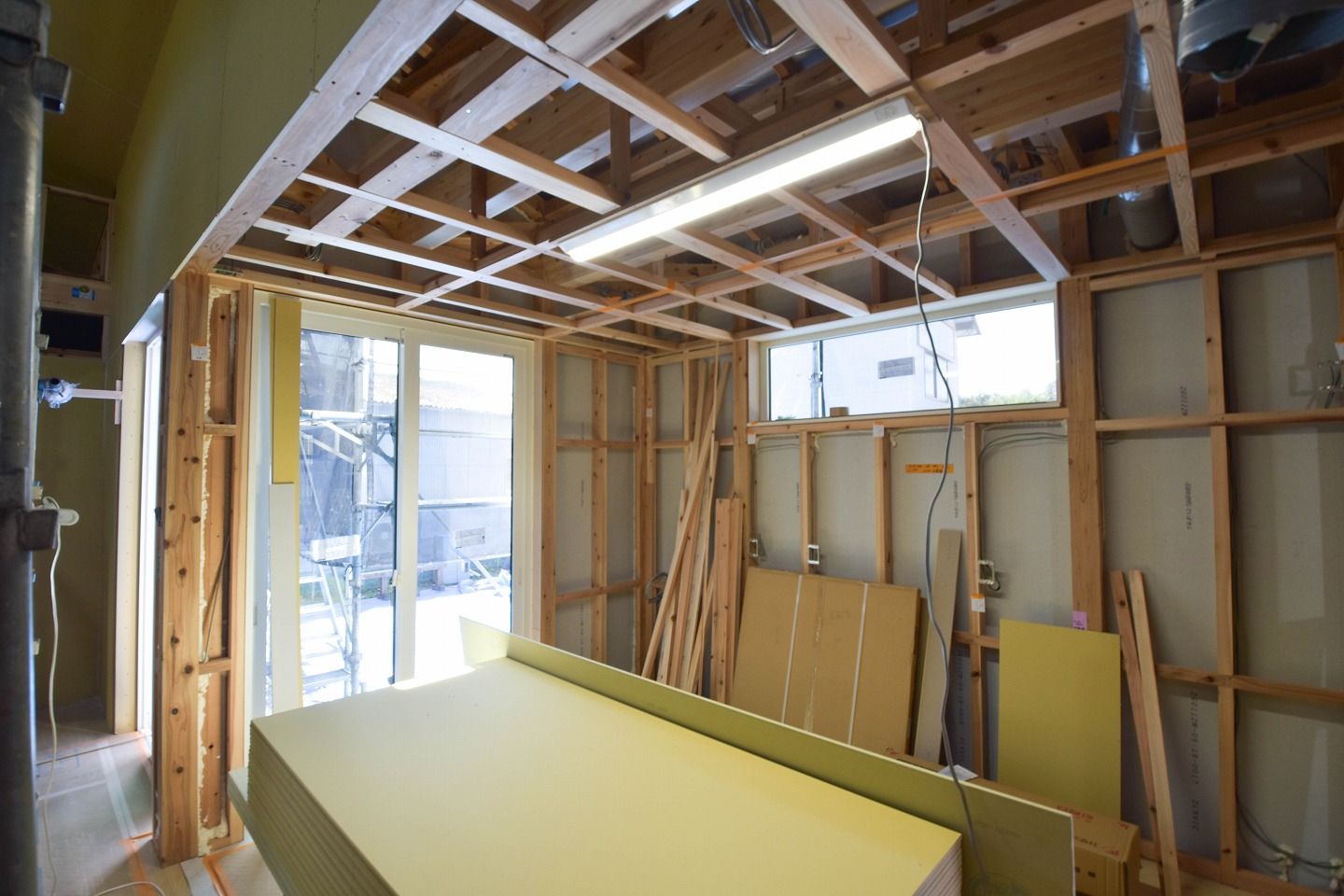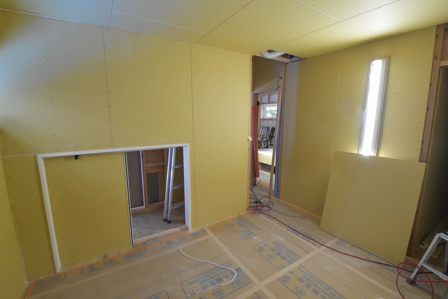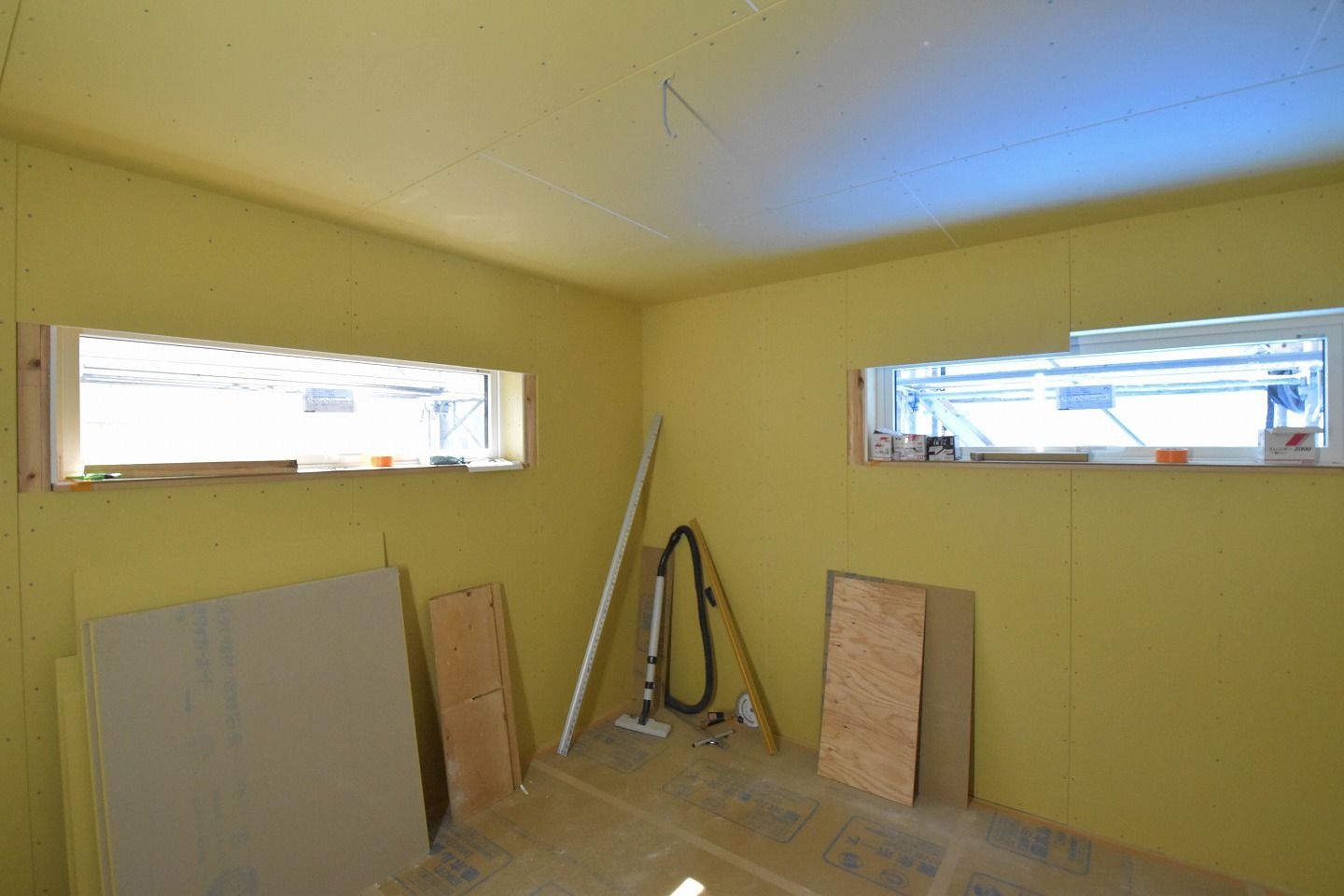 ▼こちらの部屋は、天井や壁は石膏ボードが施工されています。