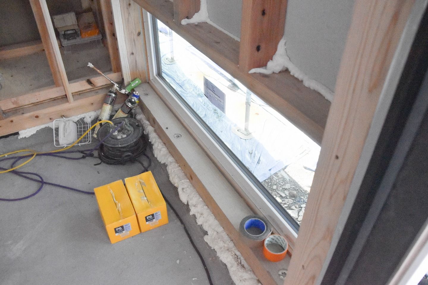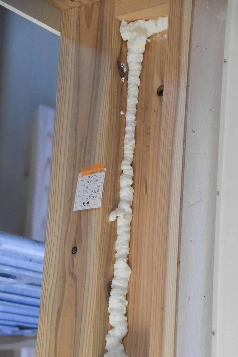 ▼気密検査に向け気密処理も行われていました。隙間になりそうな柱の間などにウレタンを充填することで、更に上の気密性を実現することが出来ます。細かいところではありますが、徹底することで高品質な住宅を作り上げることが出来ます。