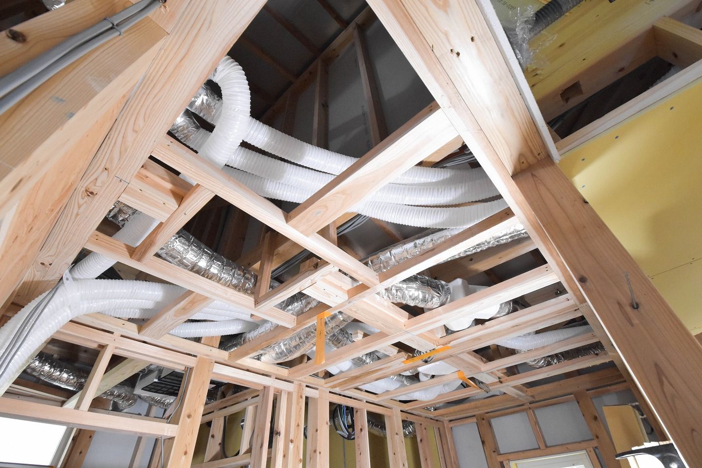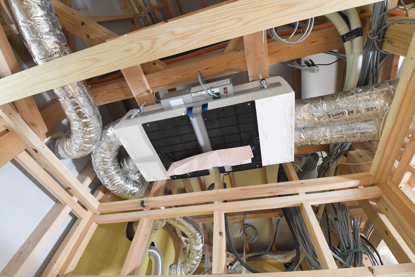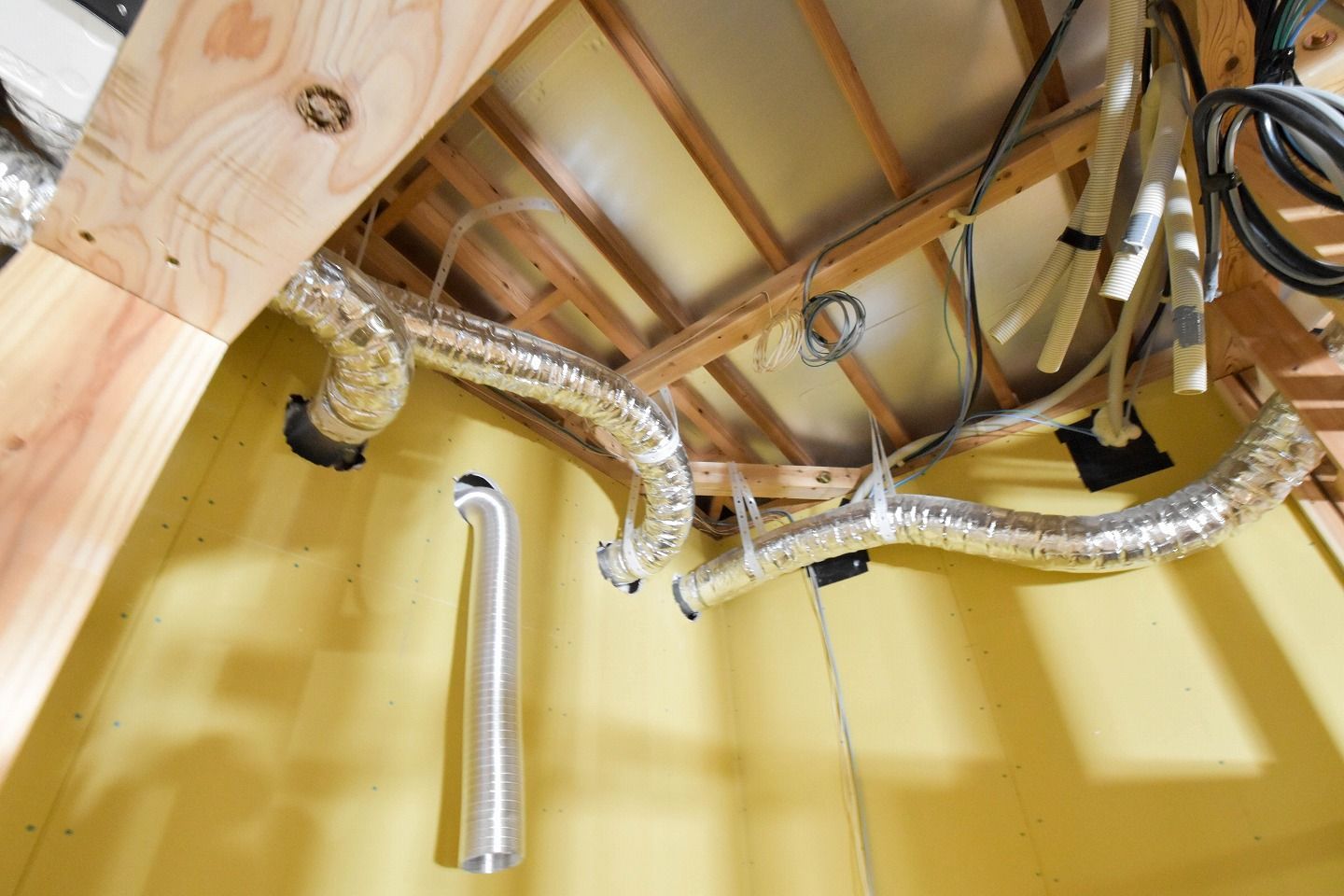 ▼浴室の上には24時間換気システムが設置され、その周りには無数のダクトが天井裏に張り巡らされています。